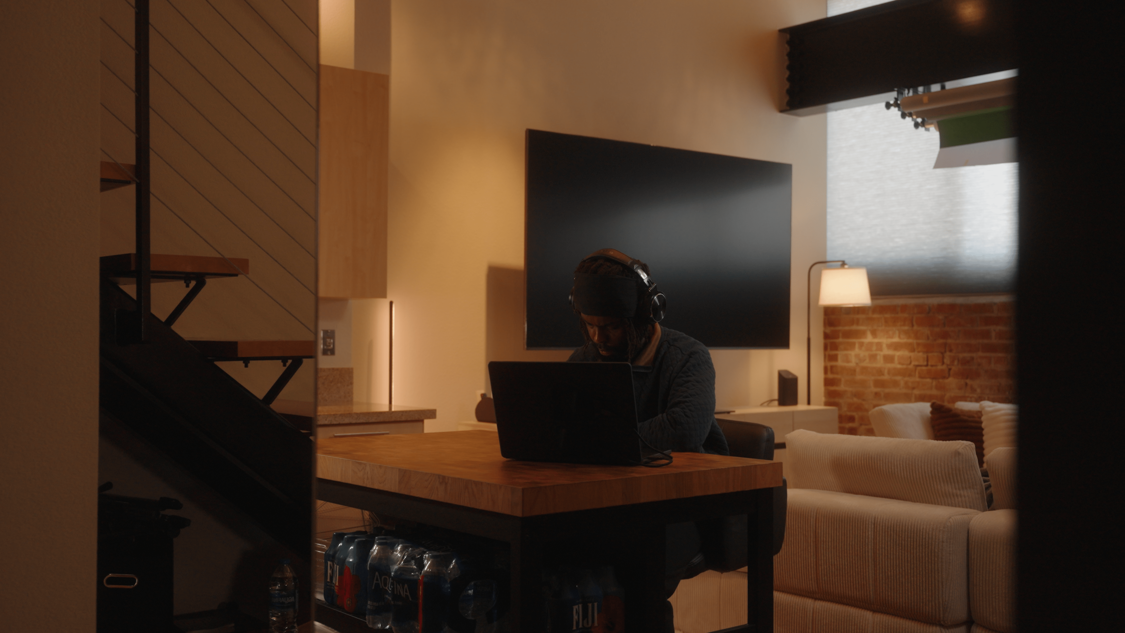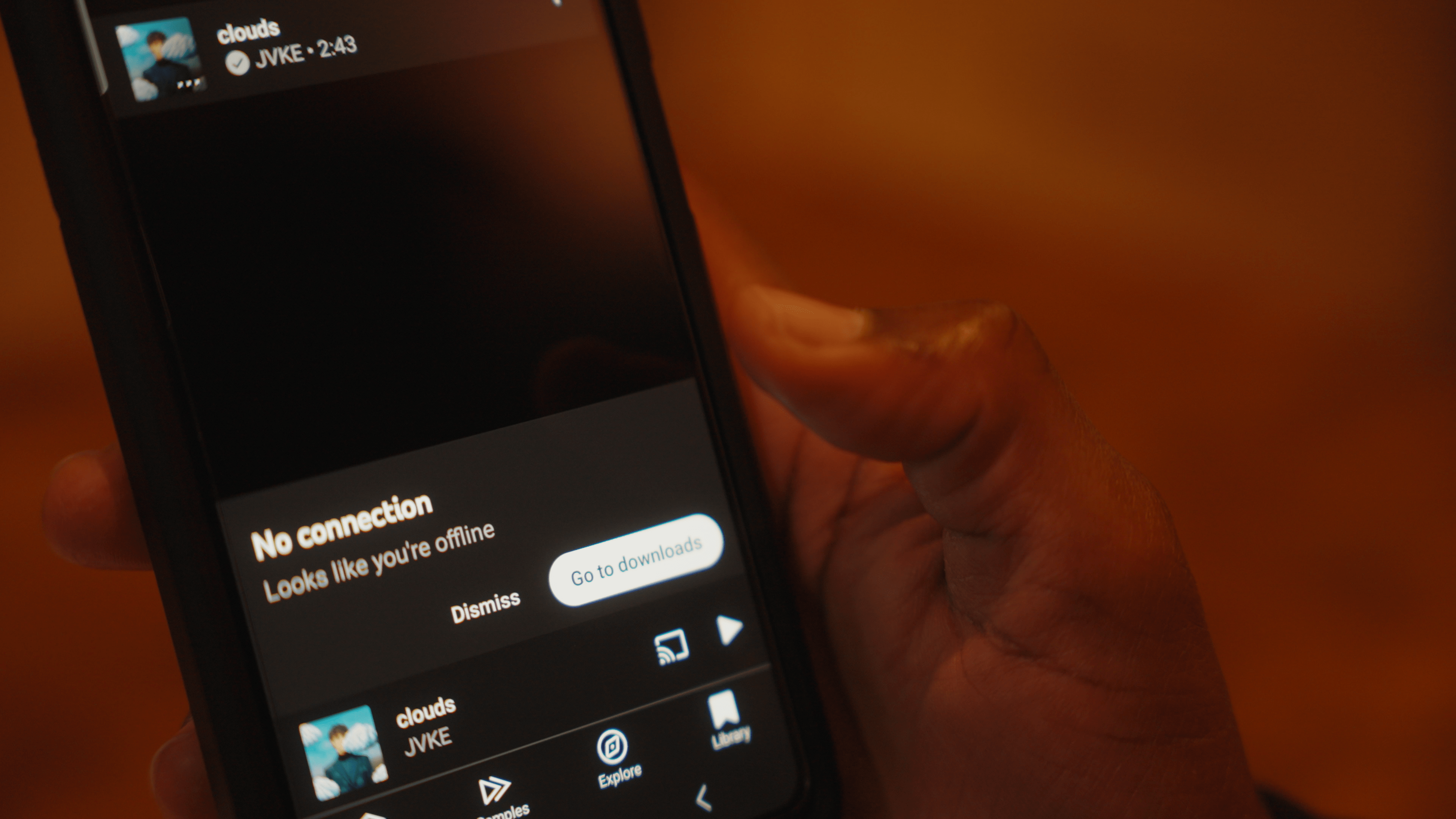 A 15 second product ad highlighting offline listening through calm pacing and uninterrupted sound, shot on Sony FX3 using Amaran lighting and practical light sources to create a calm, immersive atmosphere.